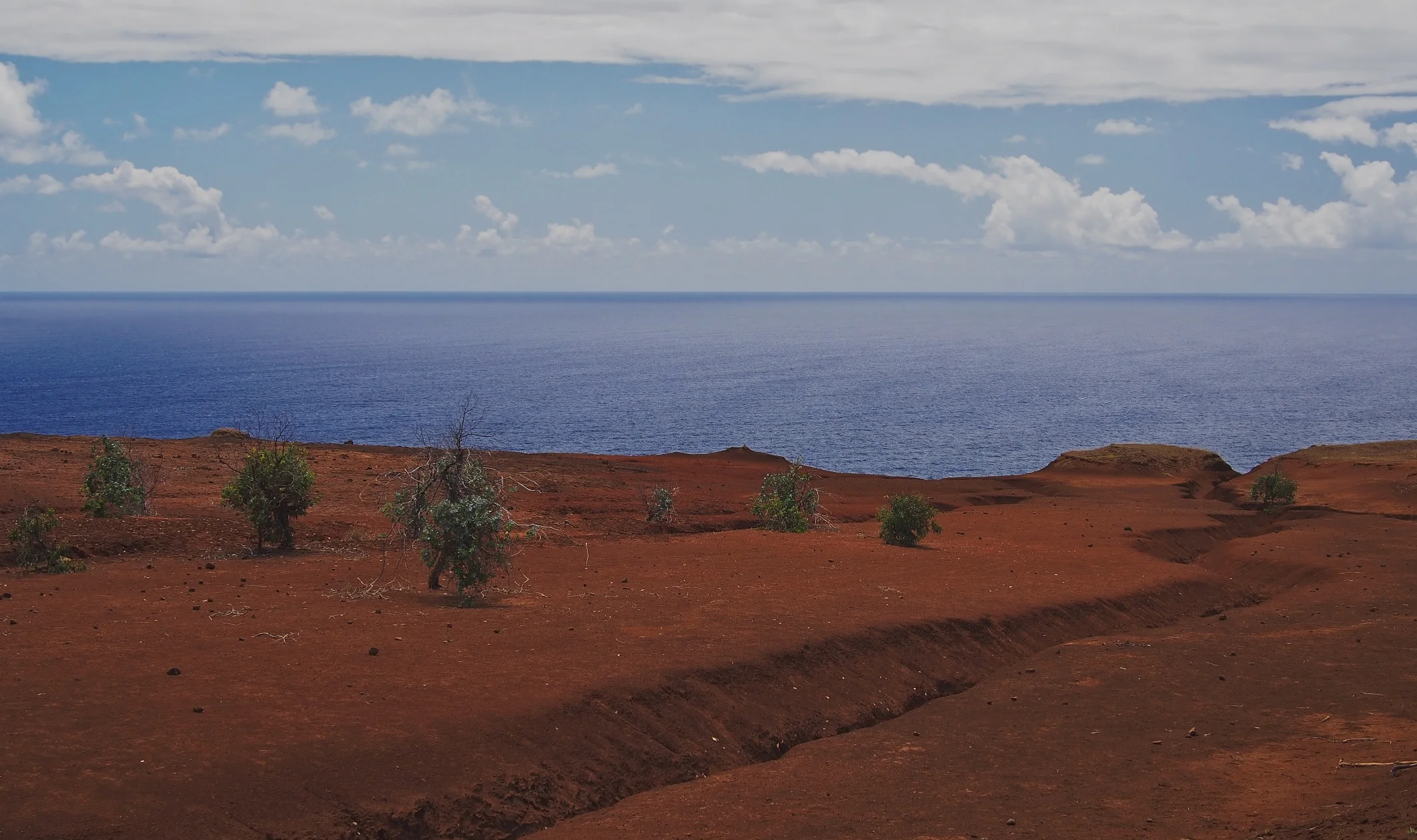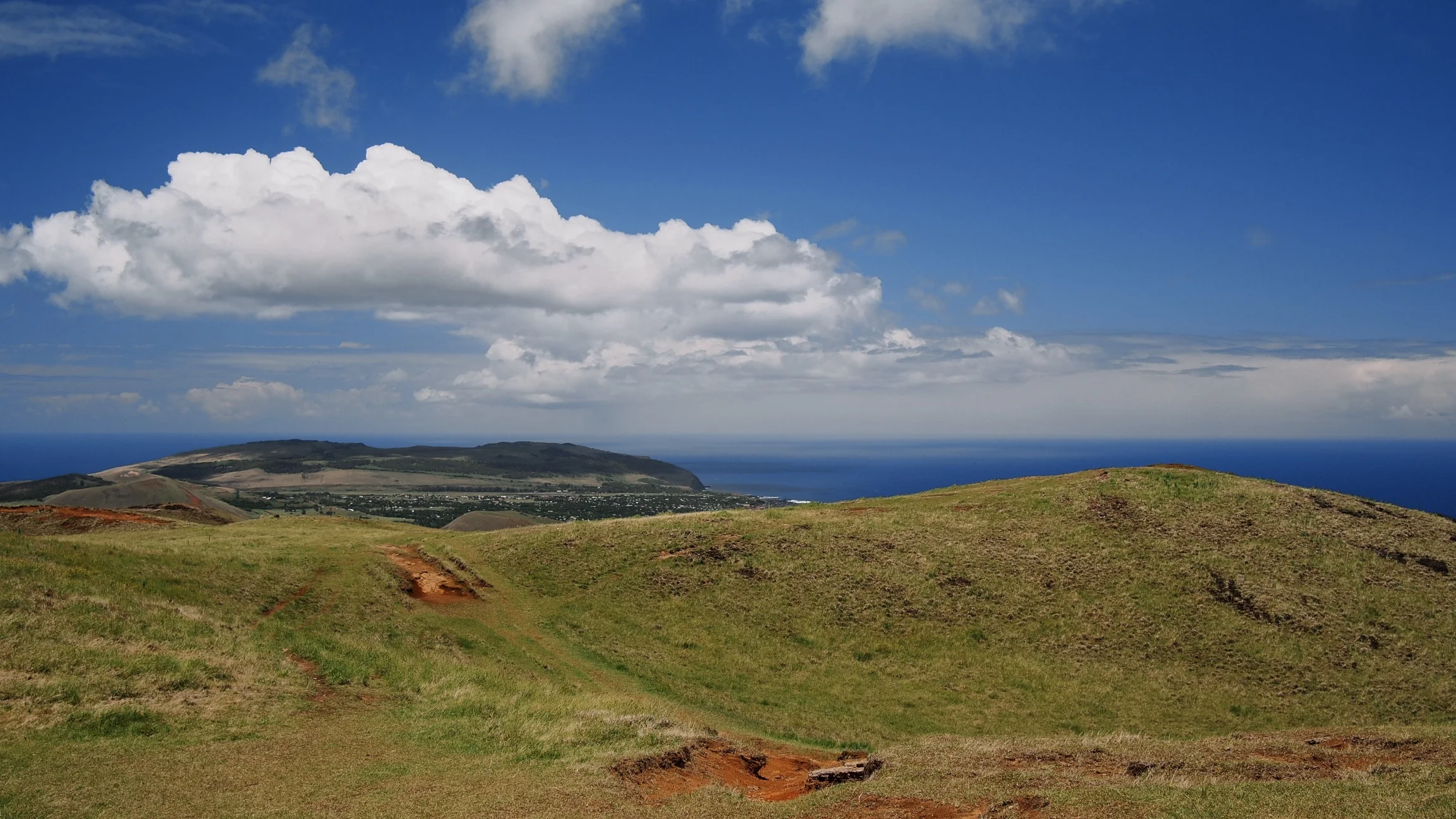 Our second hike was on the other side of the island to Poike, another extinct volcano, which no one ever visits. The gate to enter was locked but after speaking with the owner of the house nearby, we entered and tried to find any sort of path. This hike wasn't as enjoyable as we didn't always know which direction we were going in. One of the best parts of it, though, was seeing the heavy soil erosion (row 2), making that corner of the island look a bit like Mars. Finally, our third and favorite hike (row 3) was up Terevaka, the highest point on Easter Island. From there, you can see the whole island and the blue ocean surrounding it all making you feel very, very secluded from the rest of the world.